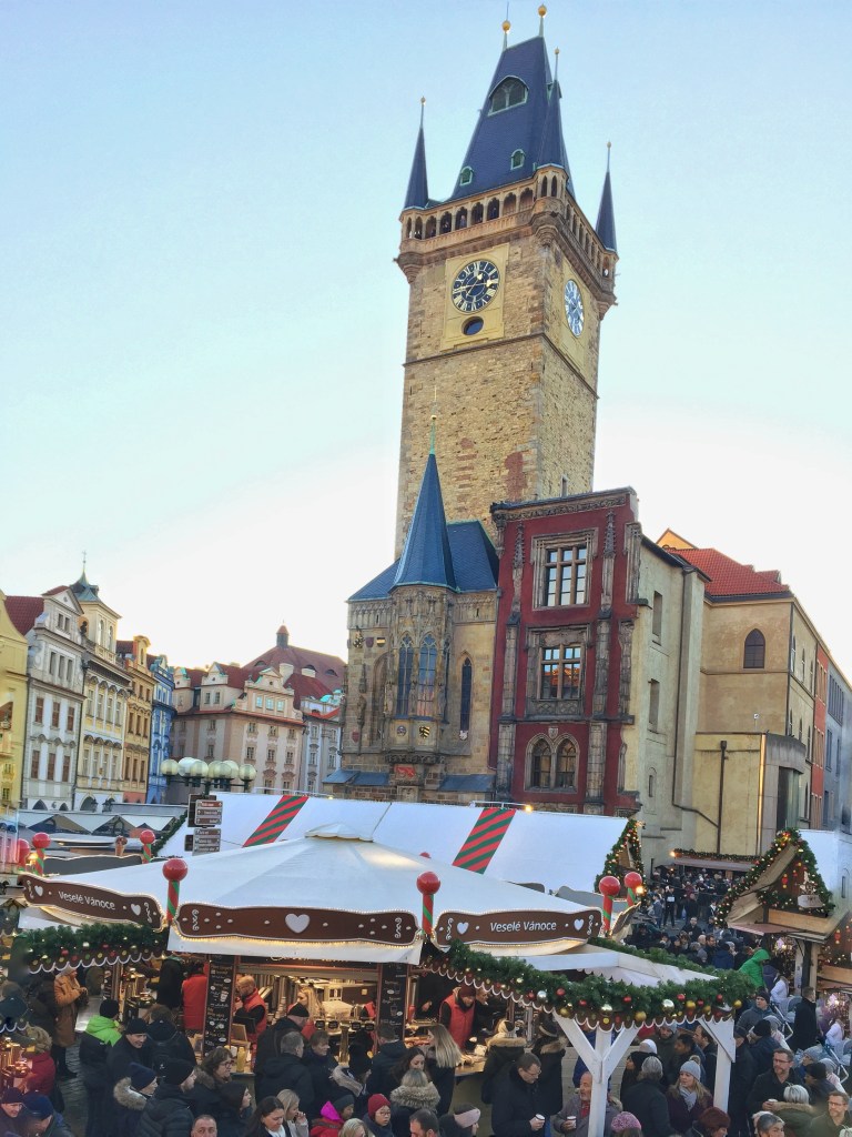 Burada şehrin en çok ziyaretçi alan Noel pazarı kuruluyor; önünde uzun kuyrukların oluştuğu yiyecek standları, ihtişamı ve süsleriyle göz alan Noel ağacı, meydana kurulan sahnedeki ilginç gösterilerle hem turistler hem de Çekler keyifli zaman geçiriyor. Ben de pazarda biraz dolaştıktan sonra Astronomik Saat‘in olduğu kuleye çıktım.