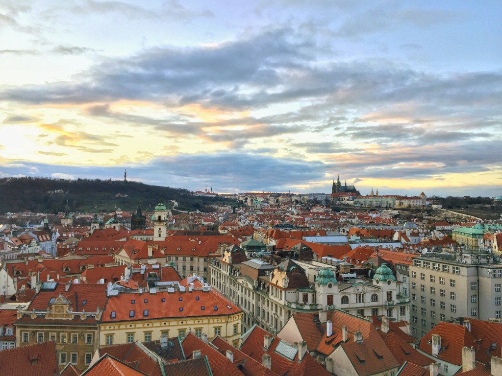 Prag’ta en iyi günbatımı fotoğrafı çekilebilecek noktalardan biri Astronomik Saat Kulesi. Gün batımından 30 dakika önce yukarı çıkmıştım; böylece hava kararmadan Noel pazarını, sonrasında Prag Kalesi‘nin arkasından kaybolan güneşi ve geriye kalan maviliği izledim.