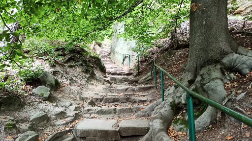 Zorlu rotanın bir kısmında böyle taş merdivenlerden inip çıkmak gerekiyor. Eğer yağmurlu havada gelirseniz sağlam bir yürüyüş ayakkabısı şart. Kumtaşının aşınması sürdüğü için her yer kumla kaplı. Şimdiden dönüşte trdelnik yesem mi diye düşünmeye başladım.